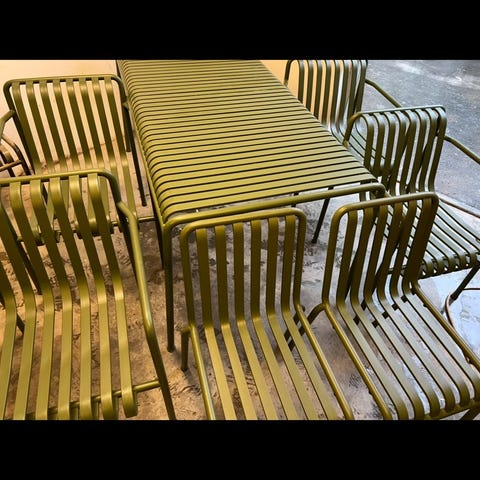 Hay Palissade matgrupp med bord, trädgårdsbänk & 2 st karmstola bänk och soffa bord olivgrön
