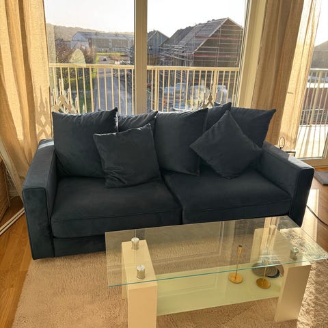 Hörnsoffa i grå mikrofiber med tre sittplatser och mjuka kuddar. Soffan har en modern design med låga armstöd och är lämplig för vardagsrum. Materialet är slitstarkt och lätt att rengöra. Det ingår även pall och soffbord .