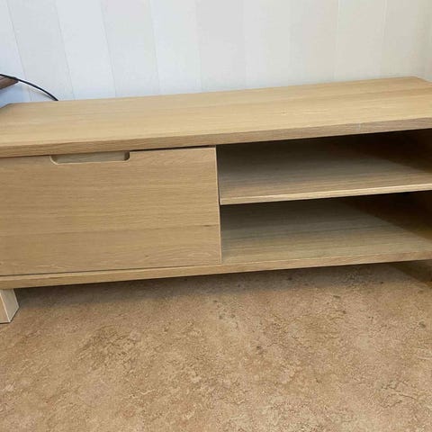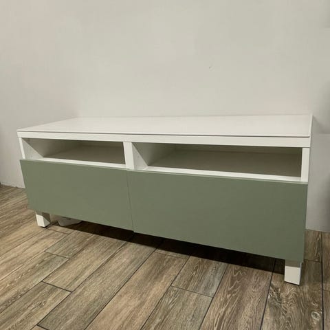 Den har gulnat lite i färgen men går säkert att få bort med något medel om man kan sånt alt måla om den. Annars är Tv-bänken stabil och i bra skick förutom normalt slitage på färgen.