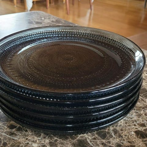 Tallrikarna är tillverkade i glas och färgen är grå/mörkgrå. De har ett mönster av droppar som är karakteristiskt för Kastehelmi-serien.