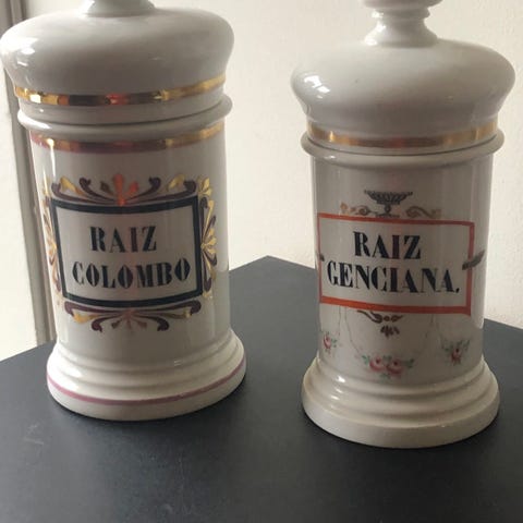 Kryddställ med plats för fyra kryddor och två oljor.Föremålet verkar vara ett litet antikt eller vintage kryddställ i glas med en metallbas. Det har skulpturala detaljer och facetterade proppar. På grund av avsaknaden av användbara sökresultat är det svårt att fastställa dess exakta ursprung, ålder eller material.