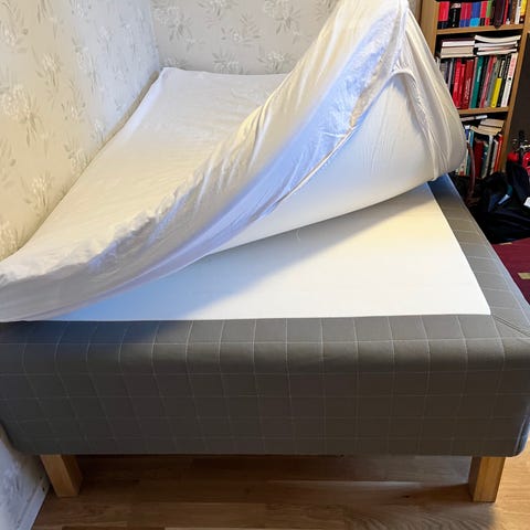 Jysk säng utan madrass, använd ett halvår, skick som ny. Har använt medföljande madrass till en annan (antik) säng som saknade madrass. Köp en madrass till så har du en komplett säng
