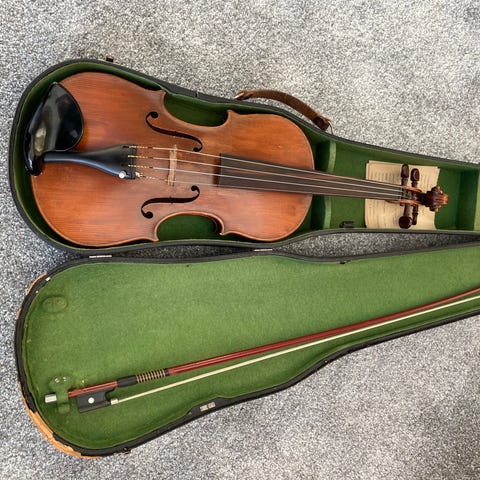 Cecilio Violin Set inklusive violin, båge, fodral och metronom. Setet innehåller även tre extra strängar. Passar för nybörjare och musiker som behöver ett komplett set med tillbehör.