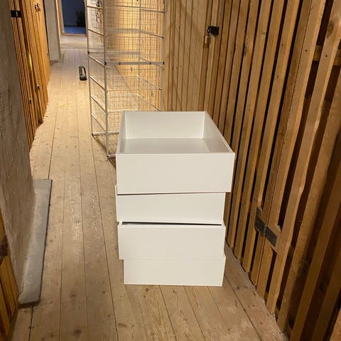 Totalt 9 stadiga utdragslådor samt 13 hyllplan (varav 11 original, 2 extra i grov plywood) och 4 klädstänger (96,5 resp 77 cm breda)