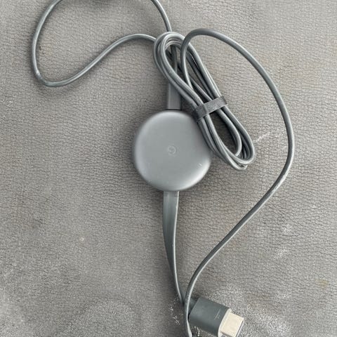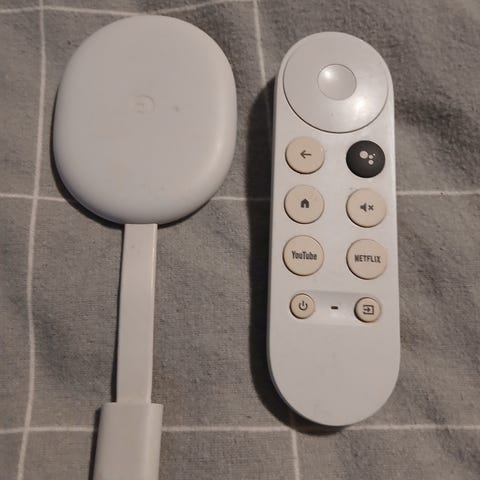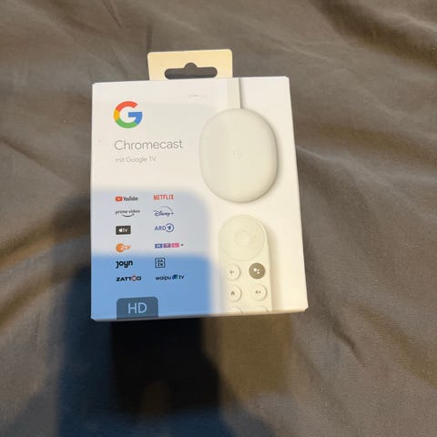 Google Chromecast streaming-enhet i vit färg med tillhörande fjärrkontroll. Enheten används för att strömma media till TV från olika appar och tjänster via Wi-Fi. HDMI kabel ingår.