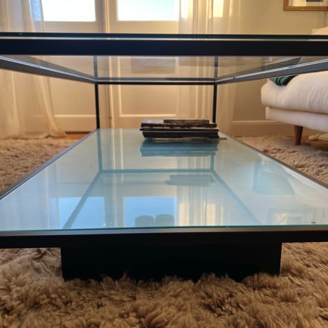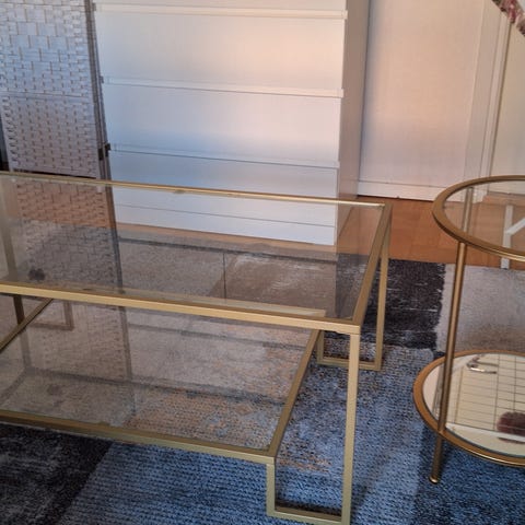 Ett soffbord och två sideboard i glas med guldram. Mycket fint skick och sparsamt använt .