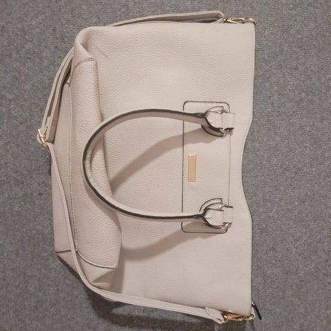 Elegant beige väska tillverkad i konstläder med justerbara axelrem och guldfärgade detaljer. Den har ett fack med dragkedja på insidan och utsidan och stängs med dragkedja. Inuti finns flera fack för förvaring och organisation av personliga tillhörigheter.