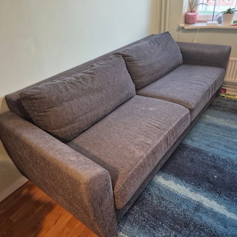 Inga synliga skador i tyget. Några mindre fläckar finns dock främst på sittdynorna - har dock inte testat att tvätta.