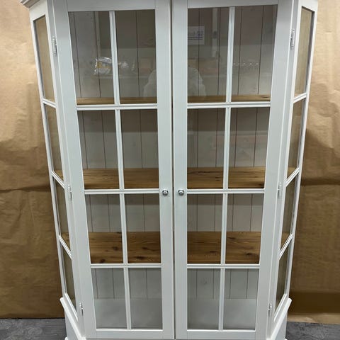 Vitrinskåp i vitoljad ask. Frostat glas i dörrarna. Skåpet är i mycket gott skick.
