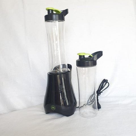 OBH Nordica Smoothie Blender med en svart basenhet och två genomskinliga flaskor med lock. Blendern är avsedd för att mixa smoothies och andra drycker direkt i flaskan för enkel användning och transport.