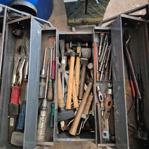 Diverse snickarvektyg samt lådor ock spik. Det är hyvlar, yxor, skruvmejslar mm