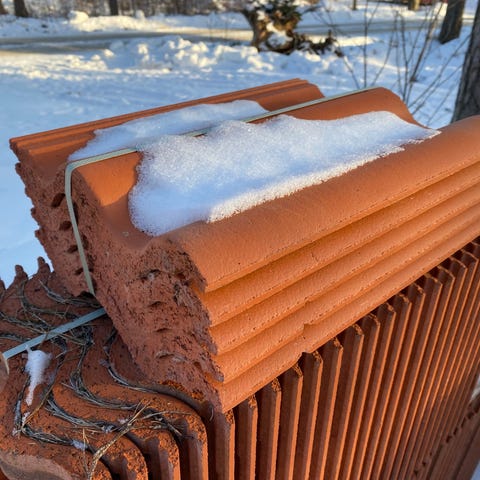 Takpannor tillverkade i tegelmaterial. Passar för användning på tak och är avsedda för att ge skydd mot väder och vind. Produkten är i röd tegelkulör och kan användas vid bygg- och renoveringsprojekt.