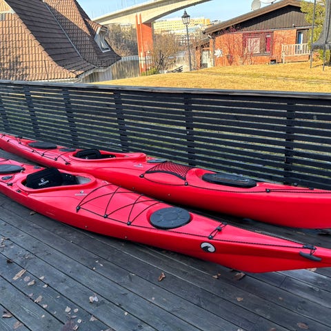 Hembyggd kajak i lauan plywood för motion och långfärd med skott och luckor. V-bottnad och därför rank olastad stabil med last. Passar mindre till medelstor kanotist. 535x54 cm 18 kg.