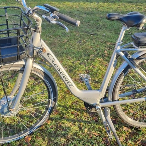 Crescent Ella 3 elcykel för unisex. Cykeln har en svart ram och är utrustad med en digital display som visar hastighet och batteristatus. Modellen är anpassad för allmän pendling och vardagscykling.