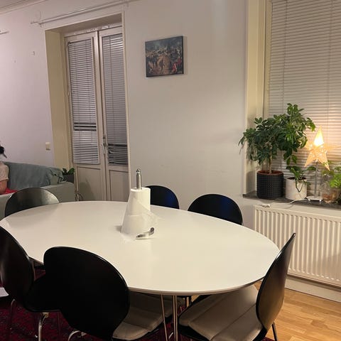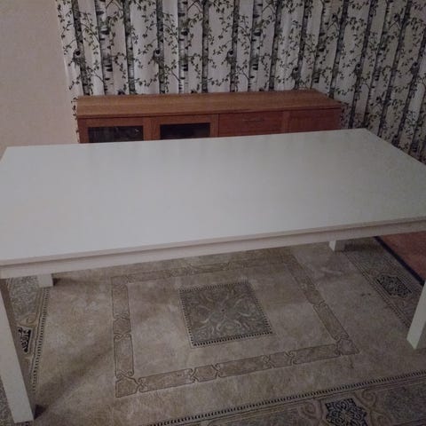 Större matbord i vitt, med iläggsskiva. Ca 3 meter långt med plats för 8-12 stolar.