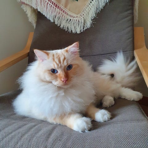 Hon är en registrerad Ragdoll med medföljande stamtavla, kastrerad och chippad.