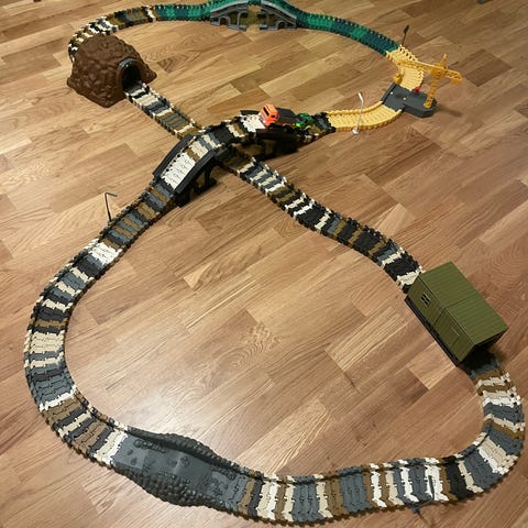 Allt är i begagnat men fullt fungerande skick. Passar bra till lek både på golv och andra ytor, lätt att bygga om och kombinera.