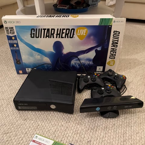 Microsoft Xbox 360 spelkonsol inklusive två trådlösa handkontroller, Kinect-sensor och Skylanders-spelplattform. Fungerar felfritt (alla sladdar som behövs ingår i köpet).