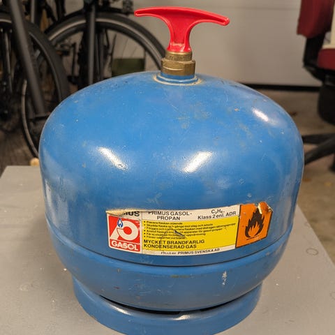 Gammal retro gasolflaska, Primus 2000 med brännare. Känns tom men är påfyllningsbar.
