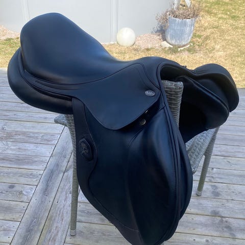 16,5 tum 35 normal mot vid, ullstopad. Fin allround mot hoppsadel, passar häst/ponny med platt rygg och kortare sadelläge. Fin i stoppning.