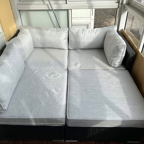 Vår balkong har tak över sig så den har varit relativt skyddad från snö och regn och jag skulle säga att den är i ett väldigt bra skick. Den slipad och sågad för att passa som just en soffa, samt att den är delvis målad med en färg anpassad för möbler utomhus men vill man så kan man givetvis måla om den :)