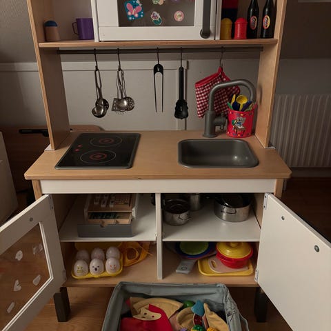 Skänker bort vårt Ikea leksakskök m tillbehör, inklusive en liten leksakskökssoffa (inte Ikea). Våra barn har älskat att leka med dessa, men nu är det dags att hitta nya barn att ta hand om det.
