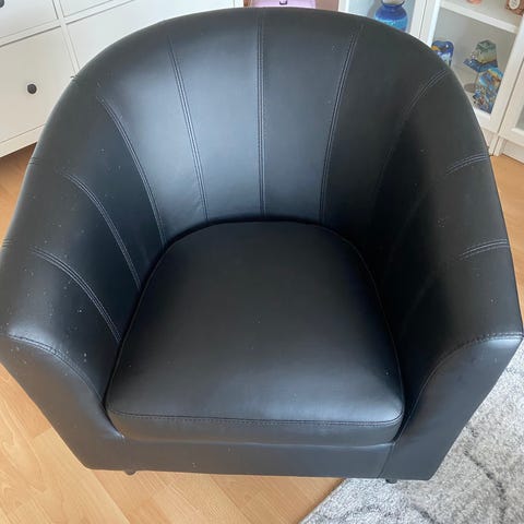 Hej! En snurrbar svart läder/fejkskinns fåtölj som är i nyskick. Inga skavanker eller slitage. Fint material, dock okänt med märke/design. Fått den av en vän som skulle byta kontor från sin förra. Funkar lika fint i hemmet som i ett kontor/eventlokal. Priset är vad jag fick rekommenderat att sälja den för, kan givetvis gå ner vid avhämtning och snabb affär.