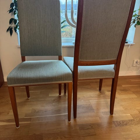 Stolarna är hela och stabila med ny stoppning och klädsel i naturfärgad linne, skulle så småningom må bra av ny färg då det finns skav och färgbortfall.