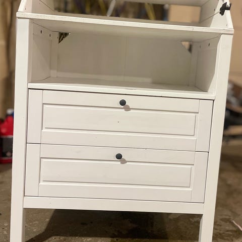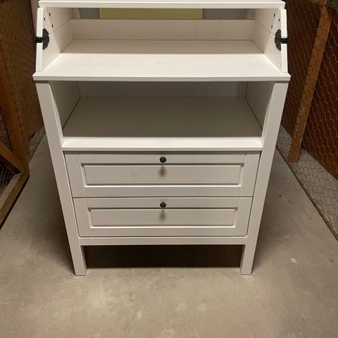 Väldigt sparsamt använder, fint skick. Kan användas både som skötbord och byrå. Knopparna på lådorna följer inte med.