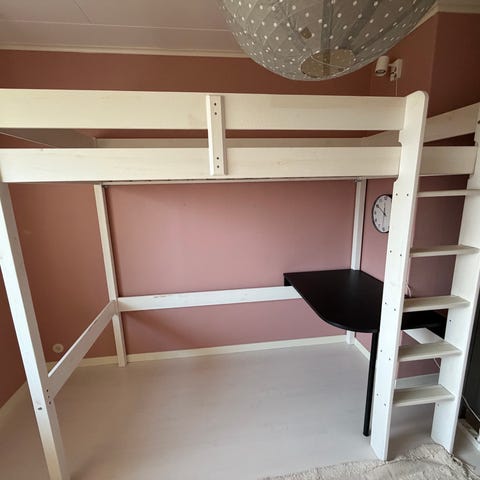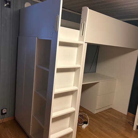 Ikea loftsäng småstad eller vad den kan heta. Är i bra skick förutom att ett av hyllplanen har lite märken och ett jack och märke efter klistermärke på baksidan/gaveln. Se bilderna
