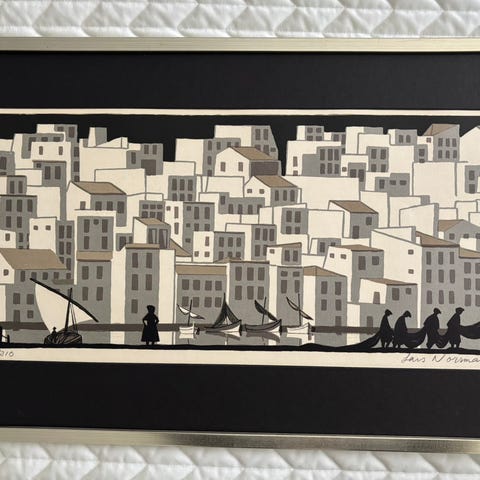 Detta är en färglitografi av Gustav Rudberg (1915-2001) Skuta i hamn