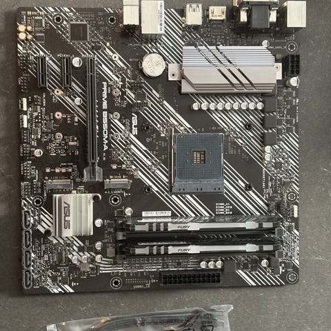MSI B550 Gaming Plus moderkort med stöd för AMD Ryzen 3:e generationens processorer. Moderkortet är svart och har flera expansionsplatser inklusive PCIe för grafikkort och minnesplatser för RAM. Passar för stationära datorer och gamingbyggen.