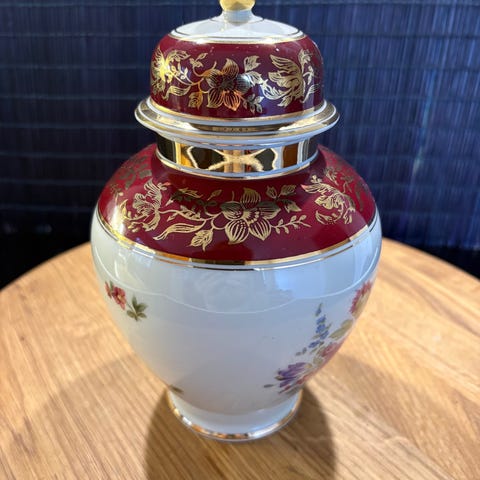 Urna med lock i äkta koboltfärgad keramik från Tyskland. Urnan är ca 17 cm utan lock, ca 12-13 cm i diameter och ca 24 hög inklusive lock.