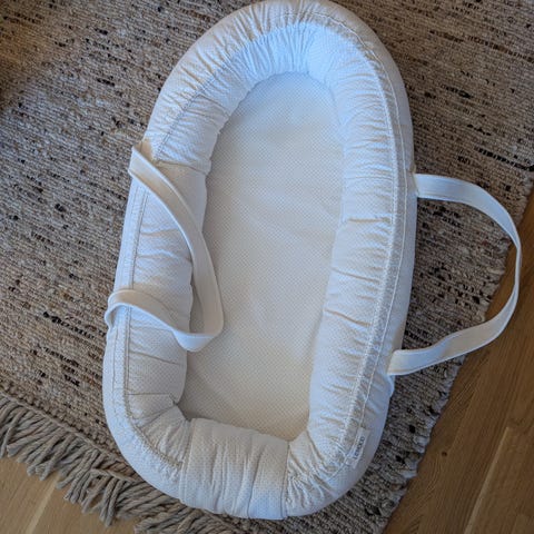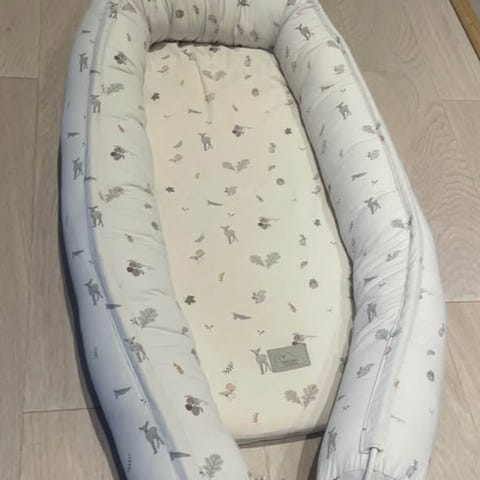 Done by Deer babynest med blått yttertyg och prickigt innerfoder. Passar för spädbarn och är tillverkad i mjukt material för komfort och säkerhet.