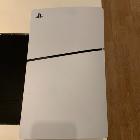 Sony Playstation 5 spelkonsol med vit färg och en matchande vit handkontroll. Konsolen har en modern design och är avsedd för spel på Playstation-plattformen.