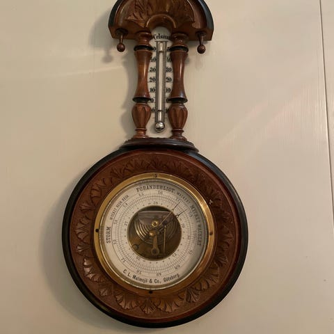 Barometer vädermätare med en rund träram och en vit urtavla med väder- och tryckindikatorer. Urtavlan visar olika väderfenomen och är inramad av en träbas.