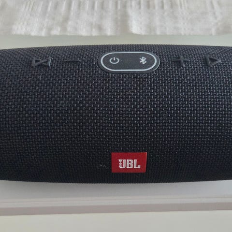 JBL Hartsfield Högtalarsystem bestående av två vita högtalare med gråa högtalargaller och en central enhet. Systemet är avsett för ljudåtergivning och kan användas i hemmiljö eller kontor. Kablar och strömadapter ingår.