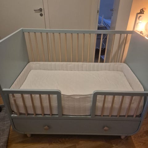 IKEA MYLLRA spjälsäng med låda i turkos färg och måtten 60x120 cm. Färgen har utgått såg jag, det finns bara vit kvar.