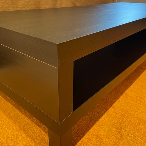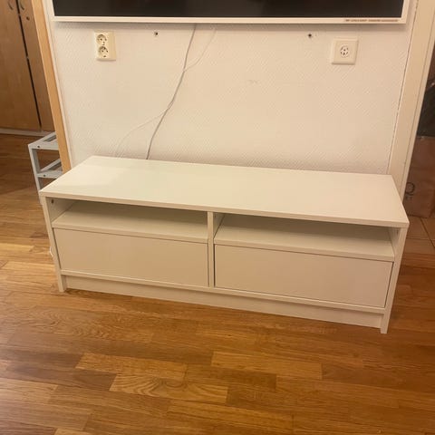 IKEA TV-bänk i svart färg med flera öppna hyllor och två lådor. Möbeln är anpassad för förvaring och placering av TV och tillbehör. Tillverkad i träliknande material - spånplatta, så inte så tung. Mycket bra skick.