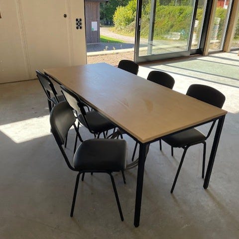 Fantastisk matgrupp med stabilt handgjort bord och 4 st korgstolar. Säljes på grund av flytt. (Ta med bärhjälp, bordet är tungt)