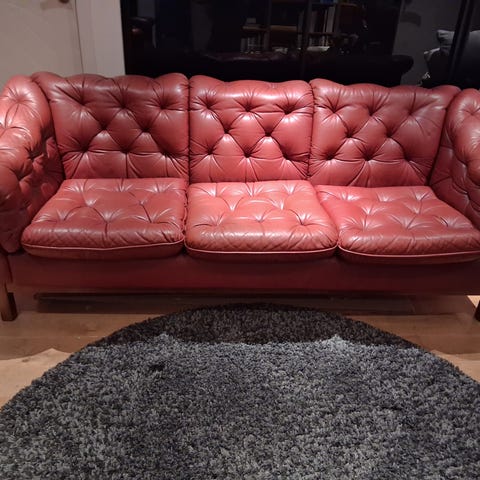 Soffa och fåtölj med delar i teak från 60-talet. Slitage och fläckar förekommer enligt bilder. Använd som det är eller klä om.