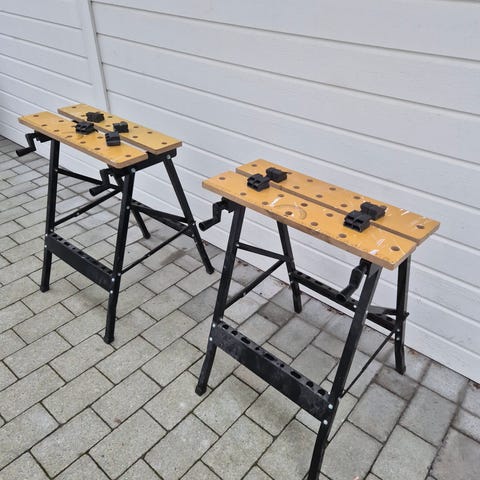 Arbetsbänk, garageinredning med förvaring under. Står på hjul så enkel att stuva undan och flytta på.