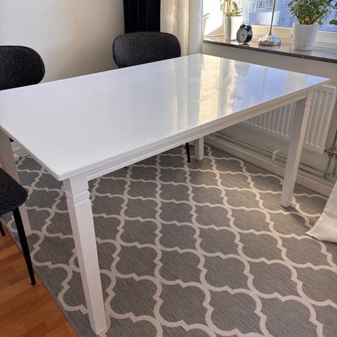 Bordet i gott skick med fåtal små repor. Tyget till stolarna går enkelt att byta ut.