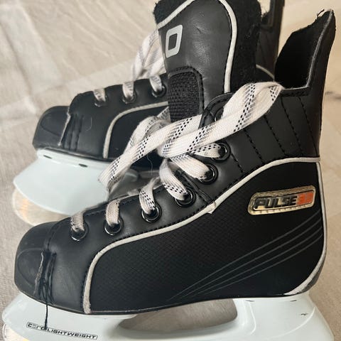 Ishockeyskridskor för barn med justerbar storlek. Skorna har en grå och svart design med blå detaljer. De är utrustade med spännen för att säkra passformen och har metallblad för isåkning.