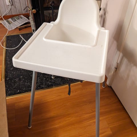IKEA Antilop barnstol i vitt plastmaterial med metallben. Enkel design med avtagbar tygsits i randigt mönster. Passar för barn och är lätt att rengöra.