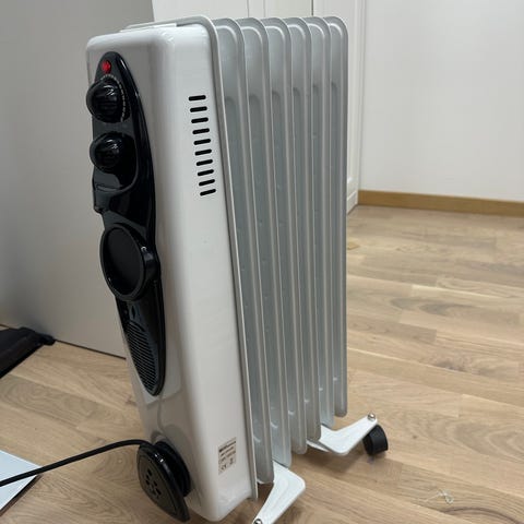 Utrustad med termostat och två vred för inställning av värmeeffekt. Försedd med hjul för enkel förflyttning.