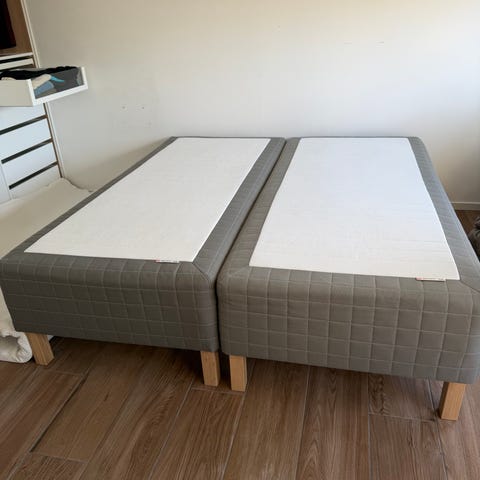 En Ikea Skotterud med grå tygklädsel och ekben. Bäddmadrass i fint skick ingår om så önskas. 90 x 200 cm. 300kr