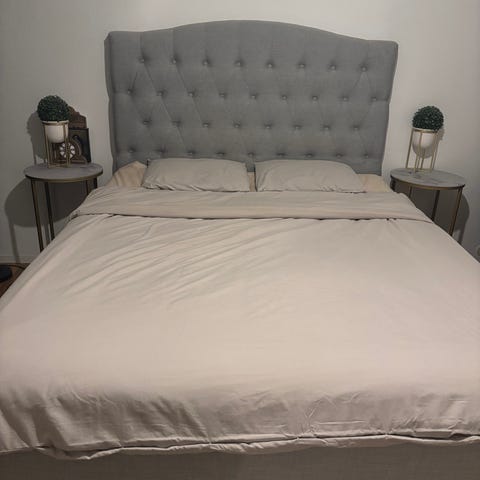 En helt ny dubbelsäng med måtten 180x200 i färgen beige.