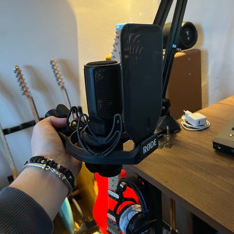 Røde NT-USB mikrofon med justerbar arm. Funkat jättebra att använda vid streaming och inspelningar. Armen är Rødes egna och sätts lätt fast i bordskanten och lämnar inga märken