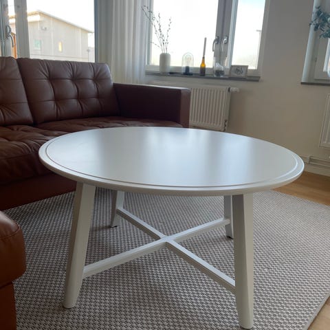 IKEA Havsta satsbord set med två vita bord. Bordens konstruktion är i trä och de är avsedda för användning som vardagsrumsbord eller sidobord.